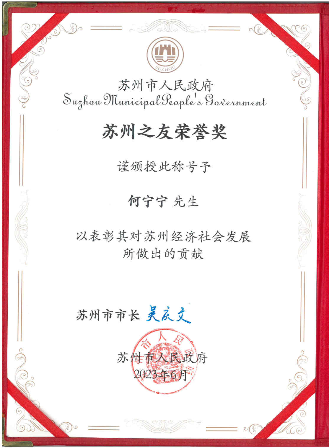近日,丘鈦科技董事長何寧寧先生榮獲今年蘇州市人民政府頒發的“蘇州之友榮譽獎”,以表彰其為蘇州經濟社會發展所做出的貢獻。