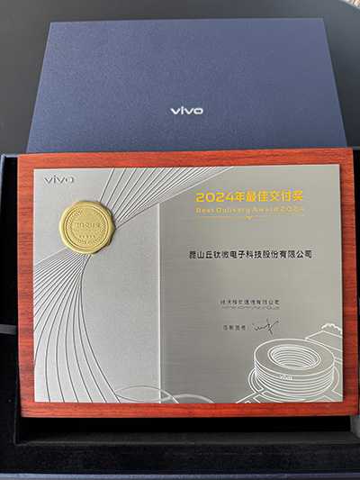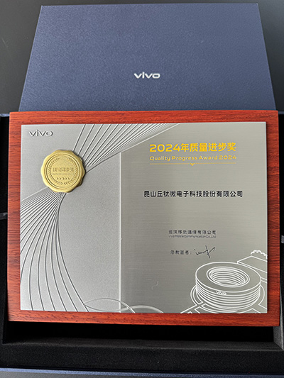 丘鈦科技全資子公司昆山丘鈦微電子科技股份有限公司近年來聚集中高端智能手機攝像頭模組產品的研發與精密制造,憑藉在精密制造和供應鏈管理方面的杰出表現,贏得了vivo頒發的“最佳交付獎”。同時,丘鈦集團始終致力于對產品質量的不懈追求,用更高超的品質表現為客戶提供高端的優質產品,獲得vivo頒發“質量進步獎”。