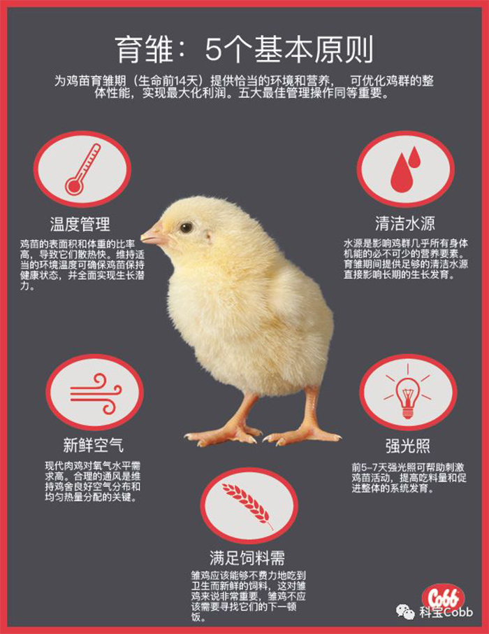 育雛的重要性需要一直被強調。為了達到最好的開端,養殖場必須提供從孵化場到育雛環境之間最佳的轉換,這包括確保讓雛雞立即吃料和飲水。
