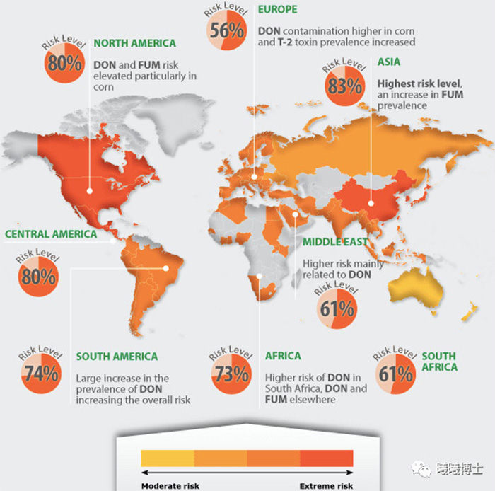 2017年全球霉菌毒素污染的調查結果 --- 亞洲的污染最為嚴重, 83%的飼料和原料樣品中至少含有1種霉菌毒素 (圖片來自biomin)