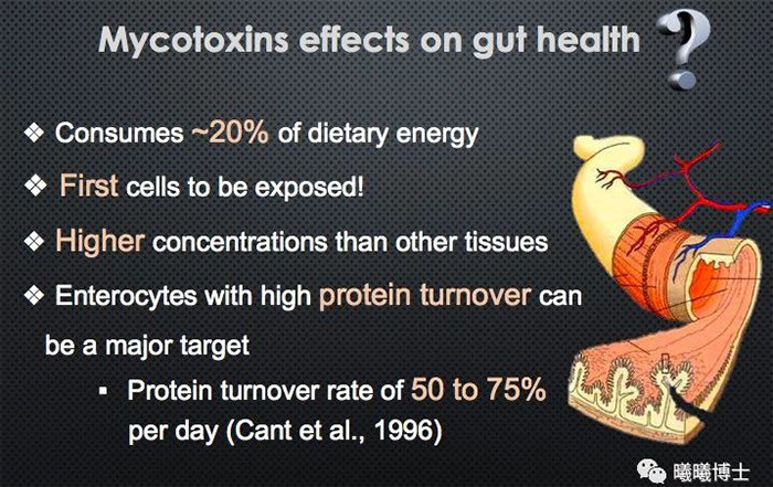 既然從理論上說,腸道直面霉菌毒素的量在身體各器官中算是最大的、又因為高蛋白周轉成為容易攻擊的目標,那么腸道健康應該是霉菌毒素研究的重點吧?然而直至今天,我們對于霉菌毒素在動物腸道的影響還并沒有很全面的了解。