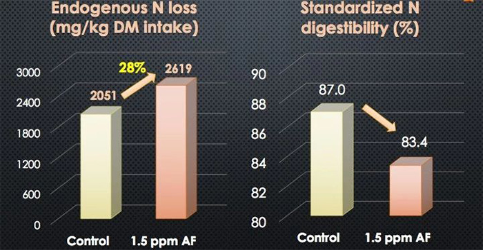 1.5ppm黃曲霉毒素對21日齡肉雞的內源氮流失 & 回腸標準氮消化率的影響 (引自Chen et al., 2016)